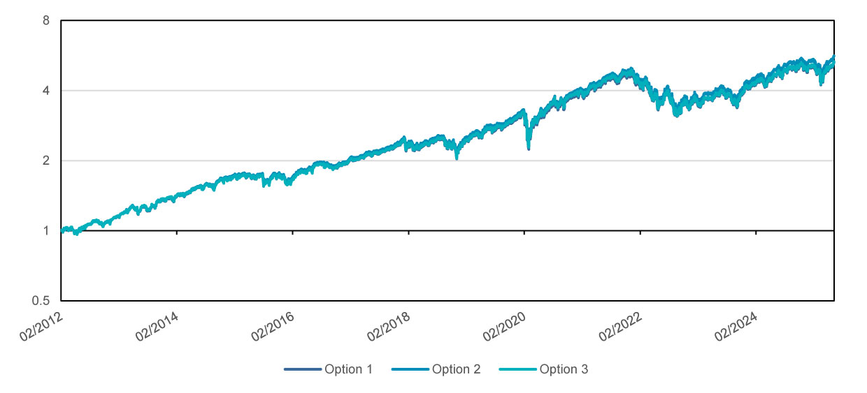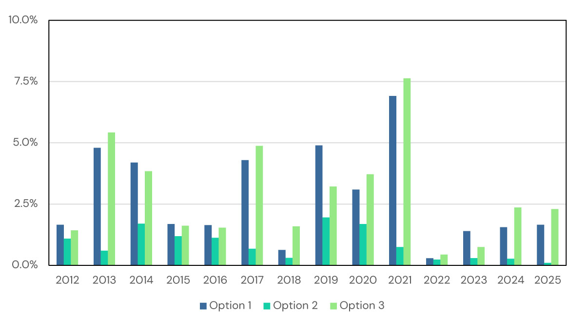 In Figure 6, we use these assumptions to estimate actual year-end tax liabilities as a percentage of investment value. For example, in 2024, the all-futures implementation (“Option 1”) had an estimated tax drag of 1.55% while Cash Equities + Treasury Futures (“Option 2”) had an estimated tax drag of just 0.27%.