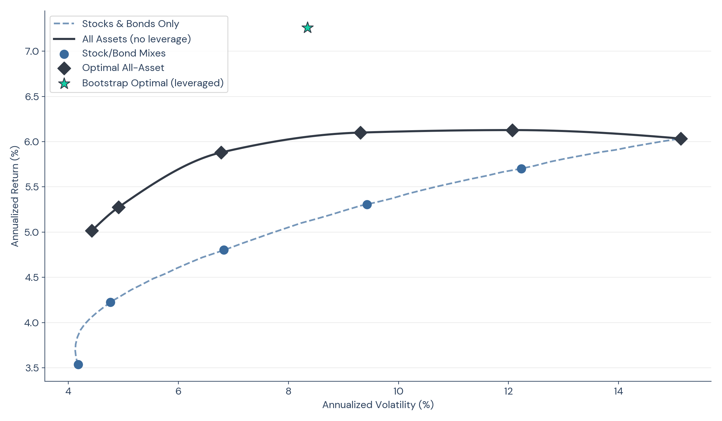 This is portfolio math 101: plot the efficient frontier, find the portfolio with the best risk-adjusted returns, and lever it to your desired volatility. When we expand the opportunity set beyond stocks and bonds, the frontier shifts upward even without leverage. At 60/40 volatility, the gap between the stock-and-bond frontier and the all-asset frontier represents the return that diversification alone can unlock. The bootstrap optimal point goes further, using leverage to push beyond what any unlevered portfolio can achieve.