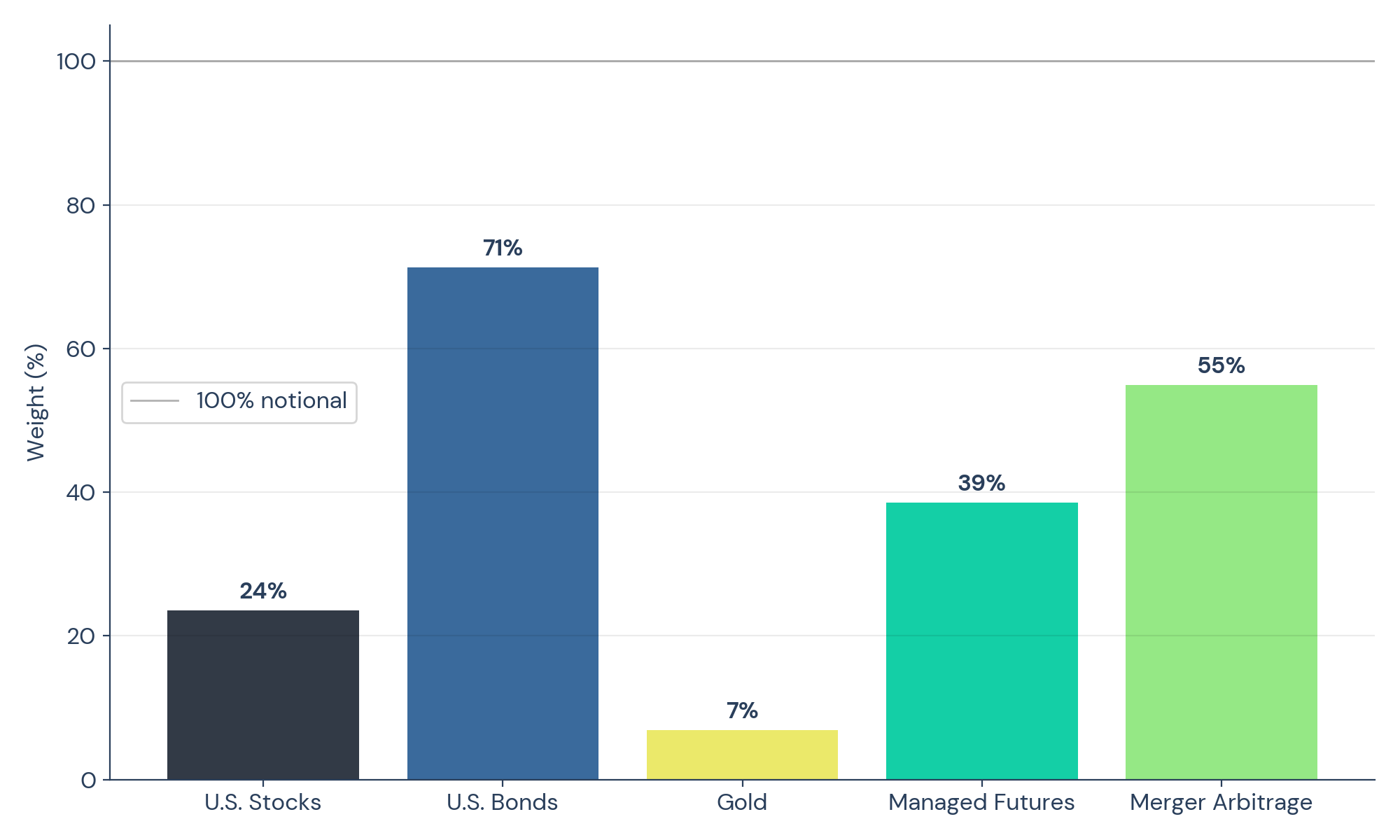U.S. Stocks is the S&P 500 Total Return Index. U.S. Bonds is the Bloomberg US Aggregate Bond Index. Gold is Spot gold (XAU/USD). Managed Futures is the PivotalPath Managed Futures Index. Merger Arbitrage is the PivotalPath Event Driven: Merger Arb Index. Financing is the Bloomberg Short Treasury US TR Index + 50bp annual spread.
