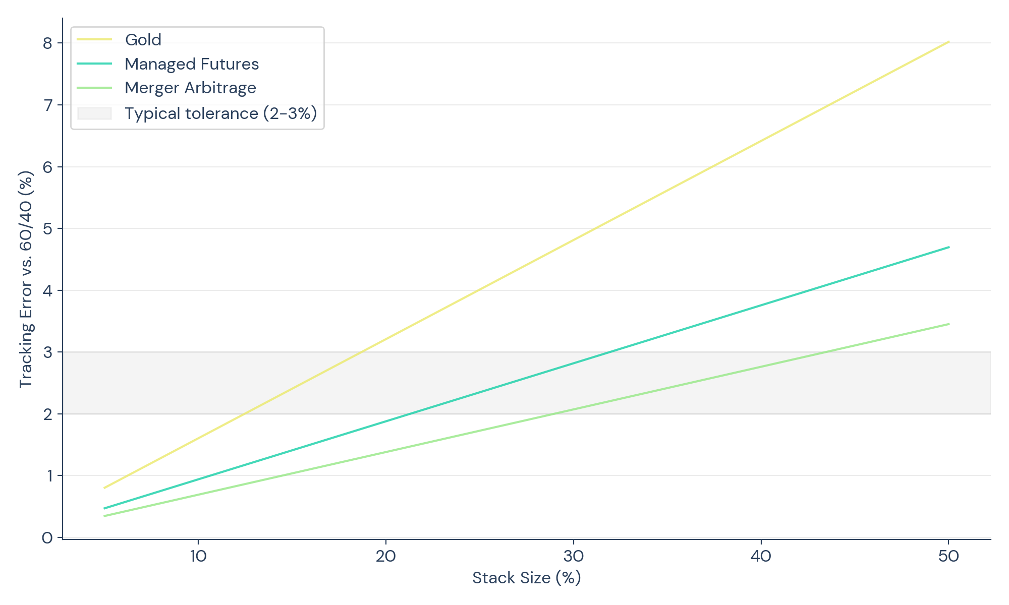 This has a practical implication that is easy to overlook: at small stack sizes, you need higher-volatility diversifiers to make a meaningful difference. A 5% allocation to merger arbitrage generates roughly 0.3% of tracking error, barely distinguishable from noise. That same 5% in gold generates roughly 0.8%. Neither is likely to materially improve portfolio outcomes.