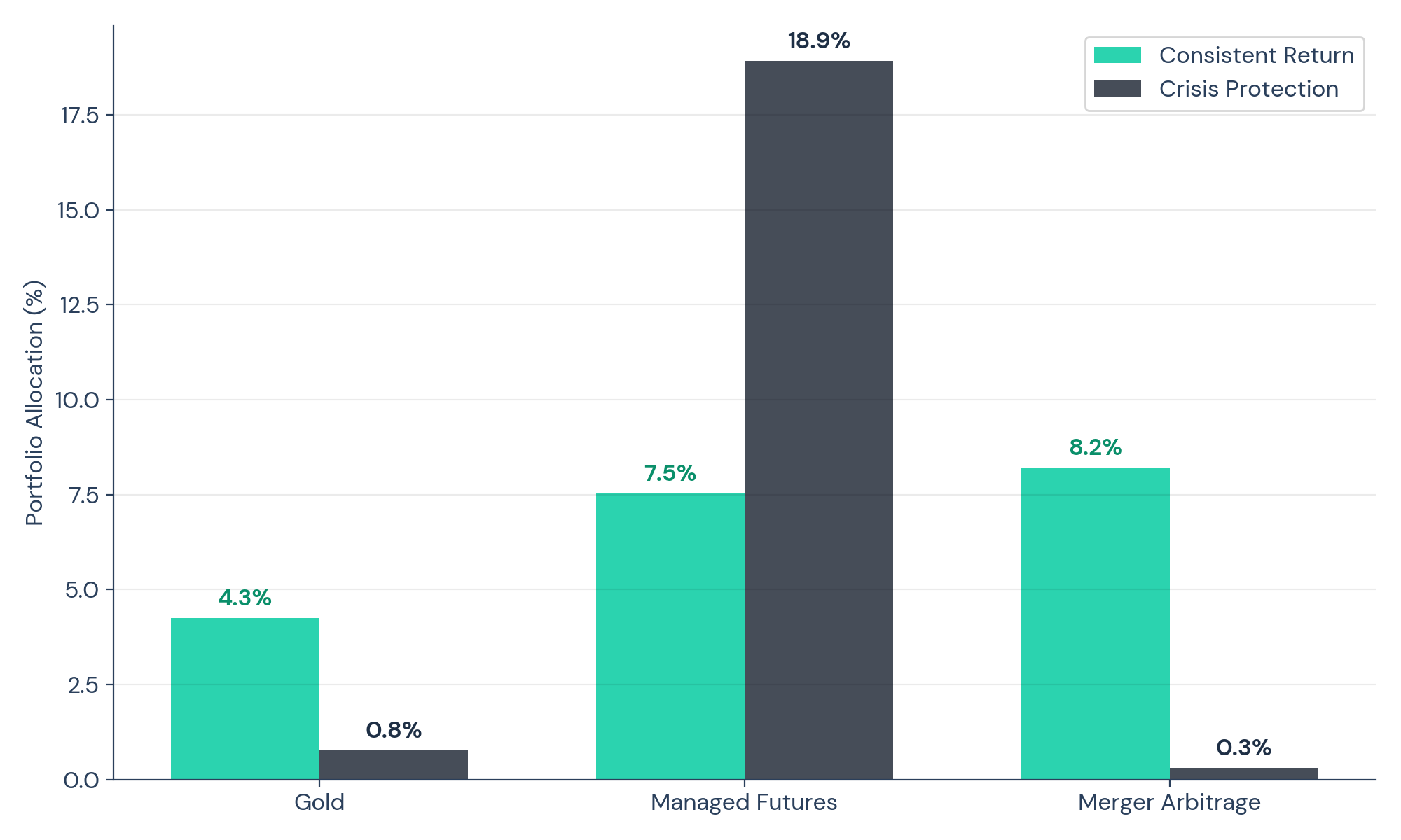 The contrast is striking. The consistent return blend diversifies across all three asset classes, tilting toward merger arbitrage for its steady excess returns and gold for its uncorrelated profile, while the crisis protection blend concentrates almost entirely in managed futures. The reason lies in the characteristics of each diversifier: