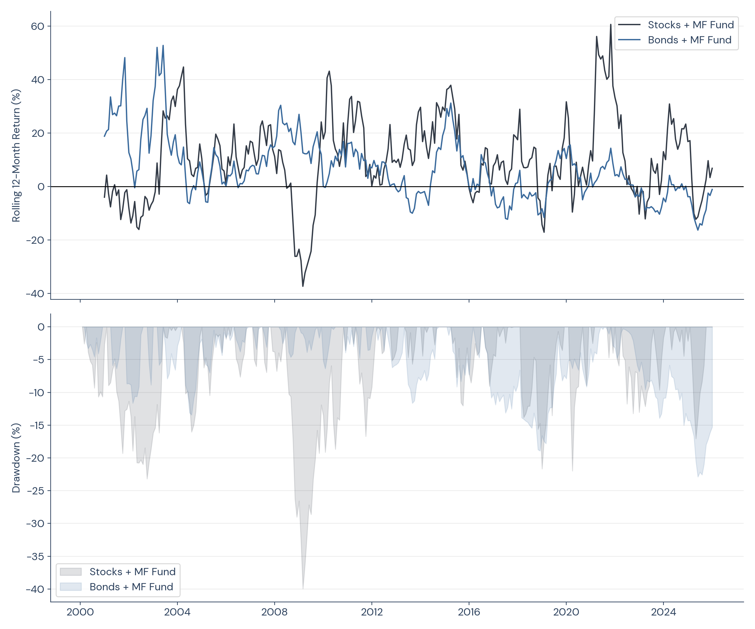 The portfolio-level returns are identical to eight decimal places. But the fund-level experience is not. The figures below plot the rolling 12-month returns and drawdowns of each fund. While both include identical managed futures allocations, they yield starkly different results because of their stock or bond components.