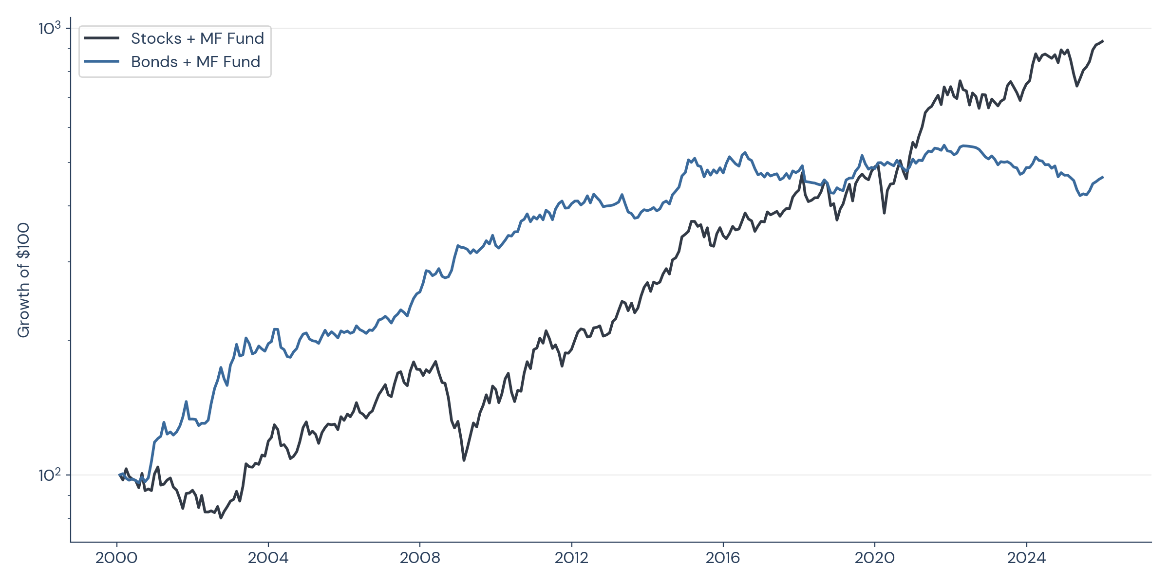 Data sources: Bloomberg (S&P 500, Bloomberg US Aggregate Bond Index, Bloomberg Short Treasury US Total Return Index); PivotalPath (PivotalPath Managed Futures Index). Calculations by Return Stacked® Portfolio Solutions. U.S. Stocks is the S&P 500 Total Return Index. U.S. Bonds is the Bloomberg US Aggregate Bond Index. Managed Futures is the PivotalPath Managed Futures Index. T-Bills is the Bloomberg Short Treasury US Total Return Index. The “Stocks + MF Fund” provides 100% U.S. Stocks exposure and 100% notional Managed Futures exposure; the “Bonds + MF Fund” provides 100% U.S. Bonds exposure and 100% notional Managed Futures exposure. Managed Futures exposure is financed at T-Bills plus 50 basis points annualized. Both funds are rebalanced monthly. Both funds produce identical aggregate portfolio returns when combined with the appropriate stock/bond holdings. Hypothetical backtested performance, January 2000 through December 2025. U.S. Stocks, U.S. Bonds, and T-Bills returns are gross of management fees, performance fees, and transaction costs and assume the reinvestment of all distributions. Managed Futures returns are reported net of management fees, performance fees, and underlying transaction costs. All returns are gross of taxes. No additional fund-level expenses are modeled. Past performance is not indicative of future results. You cannot invest in an index.